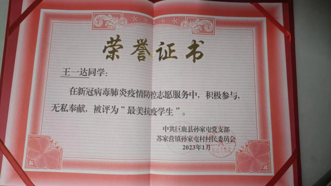 2022级大数据与财务管理班王一达同学积极响应学院的号召,利用寒假的时间积极配合家乡开展新冠防疫工作,在村里宣传新冠防控及新冠康复的科普,给村民吃“定心丸”做到不恐慌、不集聚、早治疗、早康复。