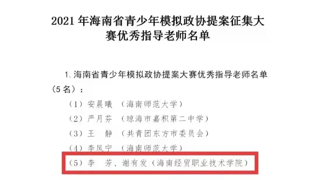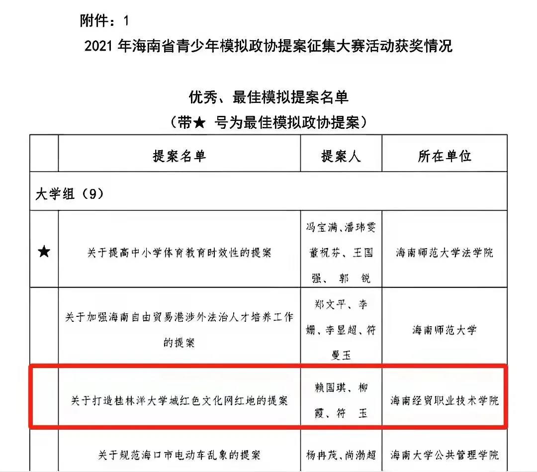 由共青团海南省委、海南省政协提案委员会和海南省学生联合会联合举办的2021年海南省青少年模拟政协提案征集大赛圆满结束。我院赖国琪、柳霞、符玉等3位同学《关于打造桂林洋大学城红色文化网红地的提案》荣获优秀奖,李芳、谢有发老师被评为“优秀指导老师”。