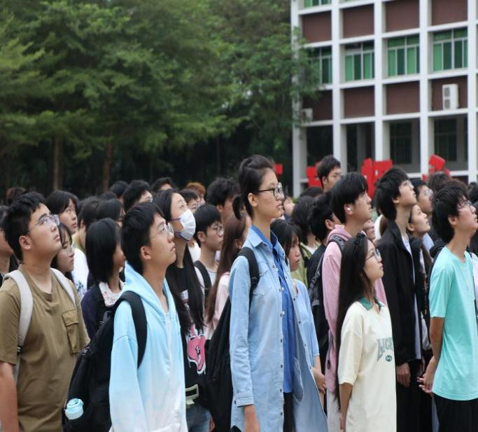 秋风微暖,晨光拂面。早上七点同学们来到经贸广场集合,伴着雄壮国歌声,鲜艳的五星红旗冉冉升起,全体同学行注目礼,高唱《义勇军进行曲》。