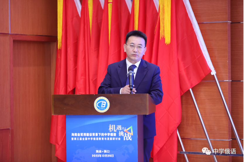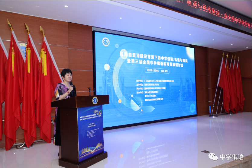 接下来,朱涛教授代广东省语言文字工作协会南方俄语教育专业委员会理事长康澄教授宣读致辞。康澄教授指出,全国中学俄语教育与发展研讨会是南方俄语教育专业委员会的品牌活动,迄今已举办过两届,这次移师海南,来到美丽的海南经贸职业技术学院,希望借助本次会议的召开,呼吁海南地区的同行关注俄语学科的发展,尤其是中学俄语的发展,助力自贸港建设,为国家培养更多优质俄语人才。
