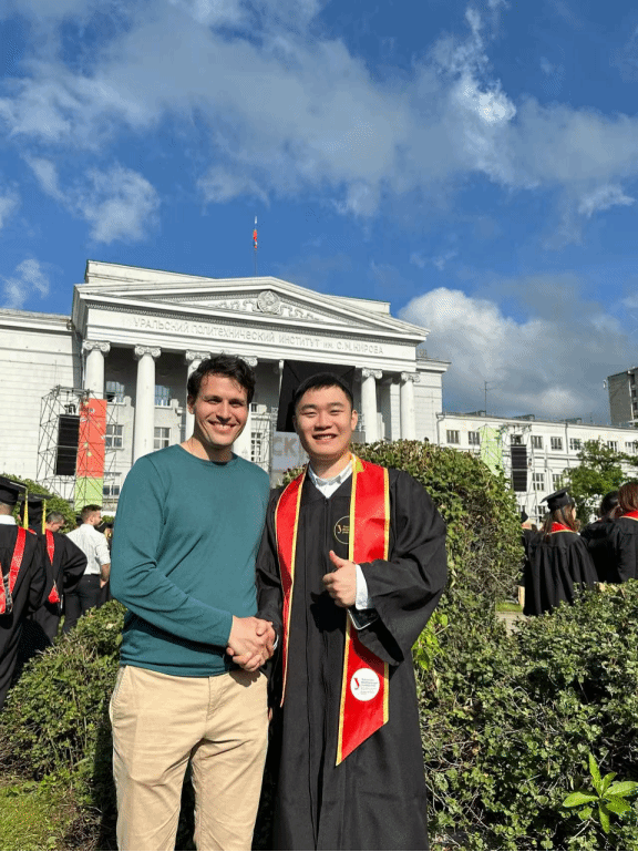这张照片是在乌拉尔联邦大学主楼前拍的,我们穿着学士服,笑得特别开心。两年,说长不长,说短也不短,经历了很多挑战,也收获了很多成就感。能顺利毕业,是一件值得自豪的事情。谢谢老师们在这段时间里对我的指导和鼓励,特别是在我语言不太好、适应困难的时候,是你们的帮助让我坚持了下来。