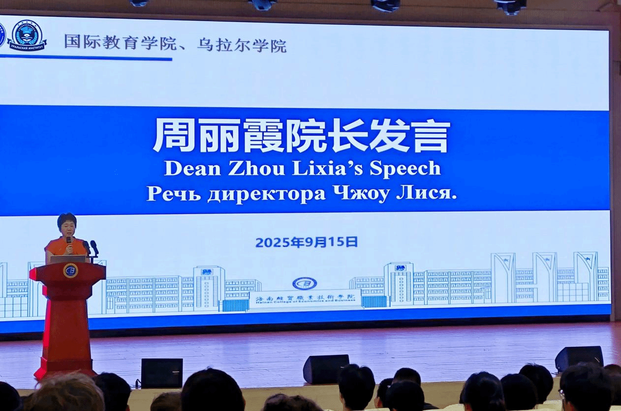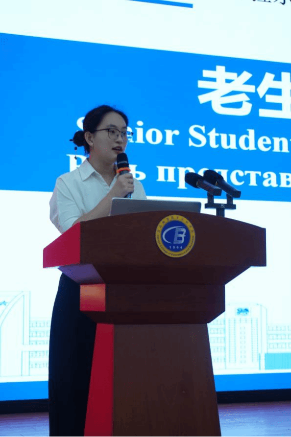 随后,院长周丽霞发表了热情洋溢的讲话。她用中俄双语对新生们的到来表示热烈欢迎,并向新生们提出了三点期望:一是要做文化的桥梁,充分利用学院国际化平台,促进中外文化交流,讲好中国故事;二是要做挑战的勇者,勇于突破自我舒适区,积极面对学习和生活中的困难与挑战;三是要做行动的巨人,将理想付诸于实践,脚踏实地,知行合一,用奋斗书写无悔青春。
