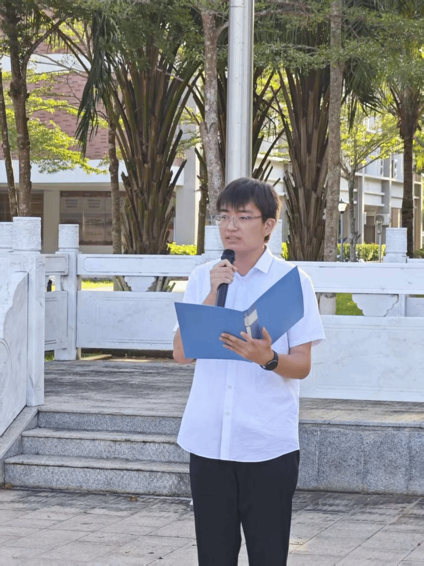 随后,2024级大数据与财务管理1班学生代表马一鸣作国旗下讲话,他以“做文明礼仪大学生,让青春与祖国同频”为主题的演讲,其中谈到作为beat365学子,需以礼仪为基并融入日常,让“经贸学子”成为可信名片”,还要将“小我”融入“大我”,以中俄青年志愿者服务自贸港等事例说明文明礼仪是行为习惯与担当,呼吁同学们从细节中践行文明,最后以“请党放心,强国有我”等表态,号召大家将青春融入祖国发展与中俄友好事业。
