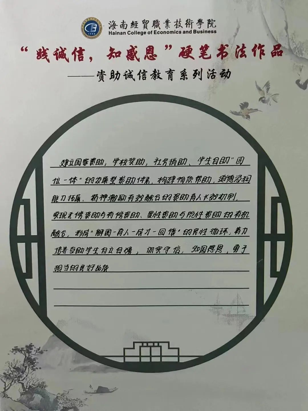 为进一步推动学生资助文化建设,激励广大受助学生奋发自强、立志成才、感恩回馈,我院开展“践诚信,知感恩”学生硬笔书法作品征集评选活动。我院共评选出四个优秀作品,让我们一起来看看吧!
