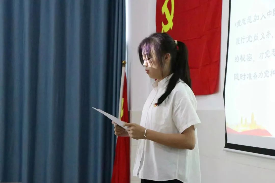 接下来在雄壮的国际歌中符玉、赖永庆、罗小鑫、刘杨兰四名预备党员在党旗下举起右手进行了庄严宣誓,表达了为共产主义事业奋斗终生的决心。